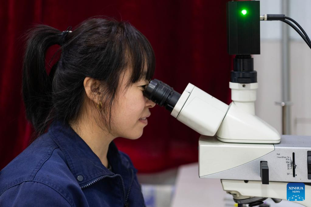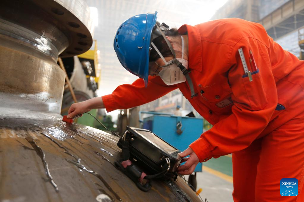 Flaw detector Li Hong works at Harbin Boiler Company Ltd. of Harbin Electric Corporation in Harbin, northeast China's Heilongjiang Province, March 6, 2023. (Xinhua/Shi Feng)