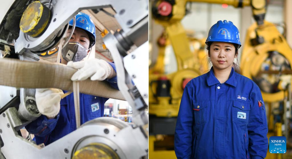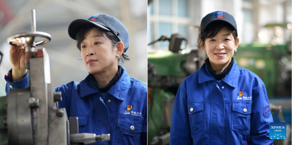 This combo photo shows computer numerical control (CNC) machinist Ge Dan working (L) and posing for a photo at a workshop of Harbin Turbine Company Limited in Harbin, northeast China's Heilongjiang Province, March 7, 2023. (Xinhua/Wang Jianwei)