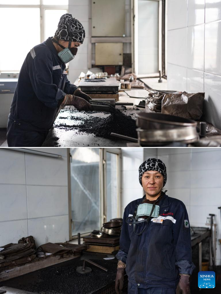 This combo photo shows worker Zuo Bingbing working (above) and posing for a photo at a coking plant in Qitaihe, northeast China's Heilongjiang Province, March 7, 2023. (Xinhua/Xie Jianfei)