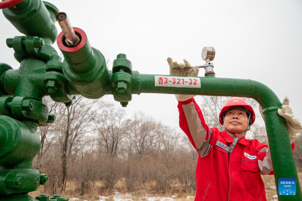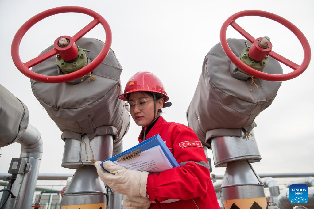 Worker Liu Baihan examines a working area of Daqing Oilfield in Daqing, northeast China's Heilongjiang Province, March 7, 2023. (Xinhua/Zhang Tao)