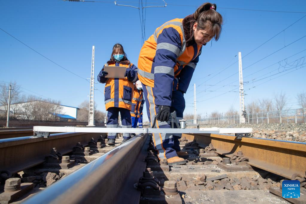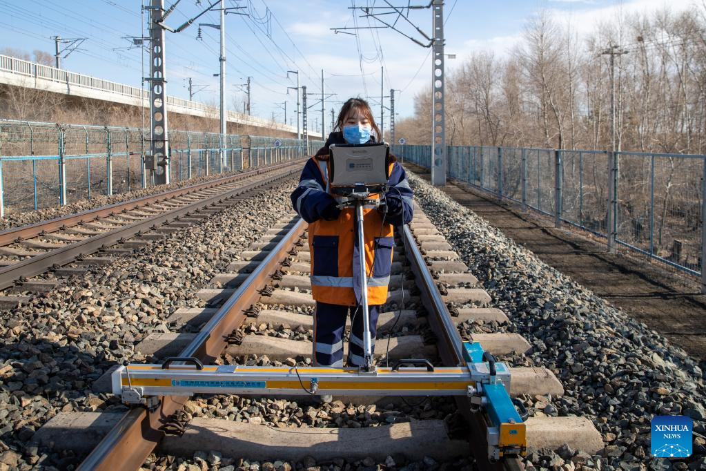 Yuan Pengpeng, a member of a female railway inspection team, works along the Harbin-Manzhouli railway in Daqing, northeast China's Harbin, March 6, 2023. (Xinhua/Zhang Tao)