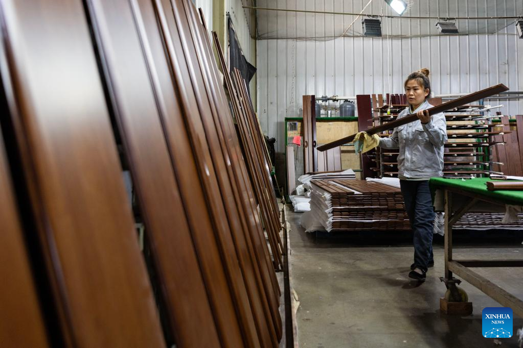 Worker Xiao Qingxia is pictured at a workshop of a furniture manufacturing company in Qitaihe, northeast China's Heilongjiang Province, March 7, 2023. (Xinhua/Xie Jianfei)