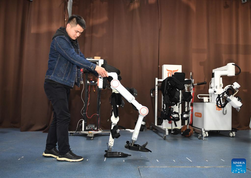 A scientific researcher from the Robotics Research Center at University of Electronic Science and Technology of China (UESTC) checks on an exoskeleton robot in Chengdu, southwest China's Sichuan Province, March 6, 2023. (Xinhua/Liu Kun)