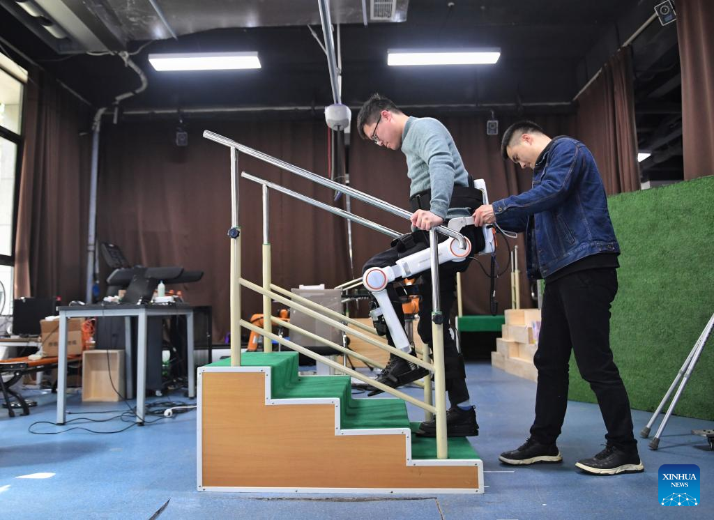 A paraplegic walks with the help of an exoskeleton robot developed by the Robotics Research Center at University of Electronic Science and Technology of China (UESTC) in Chengdu, southwest China's Sichuan Province, March 6, 2023. (Xinhua/Liu Kun)