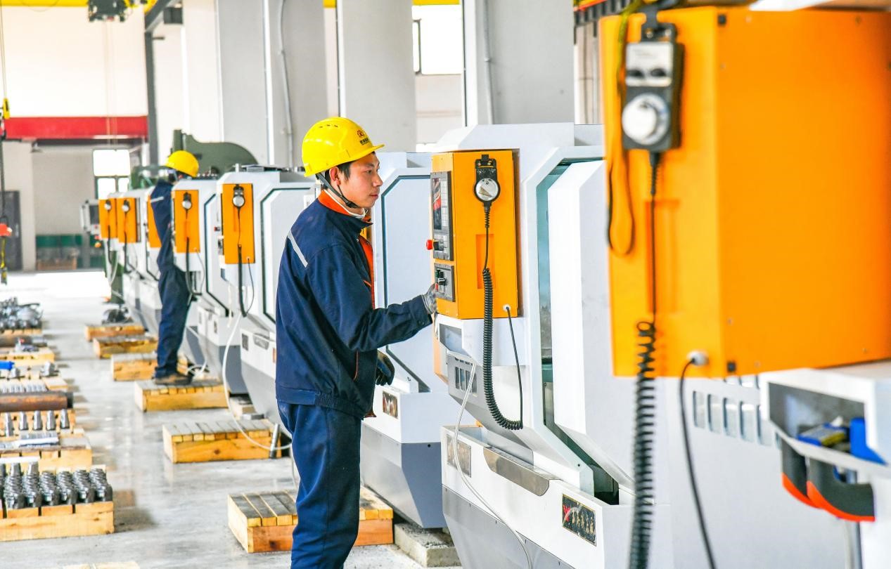 Employees operate production equipment in a workshop of a valve manufacturing company in Bazhong, southwest China's Sichuan province, Feb. 24, 2023. (People's Daily Online/Cheng Cong)