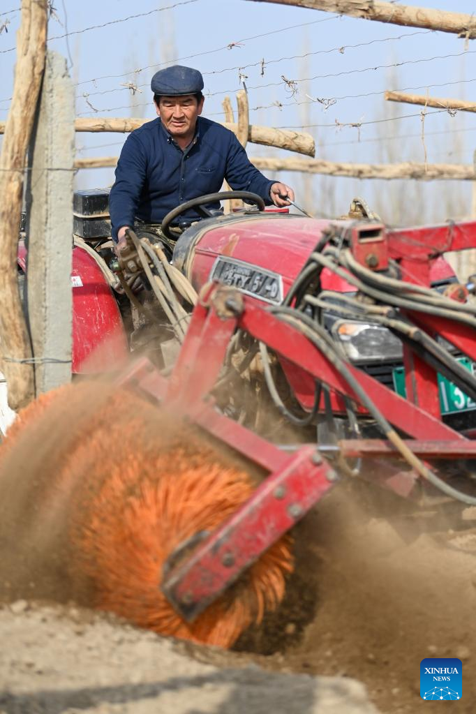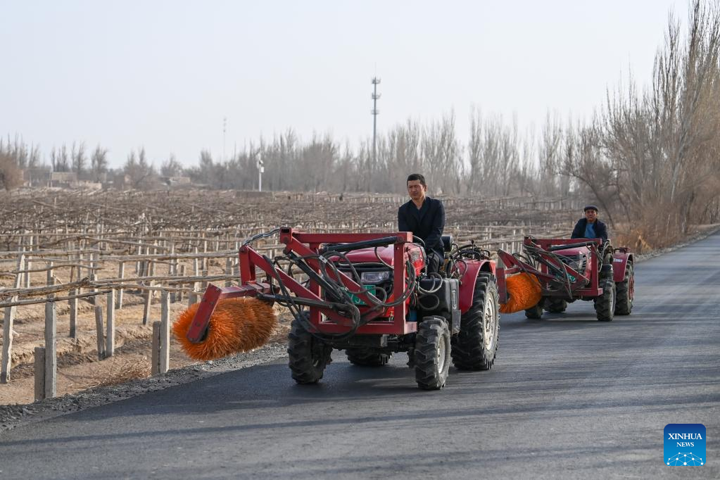 Farmers drive machines to the grape field in Putao Town of Turpan, northwest China's Xinjiang Uygur Autonomous Region, March 8, 2023. Every winter, farmers here bury grape vines underground to keep them warm during the cold weather and dig them out and put them on trellises in the springtime. More farming machines have been put into use, which not only saves labor costs, but also greatly increases efficiency. (Xinhua/Ding Lei)