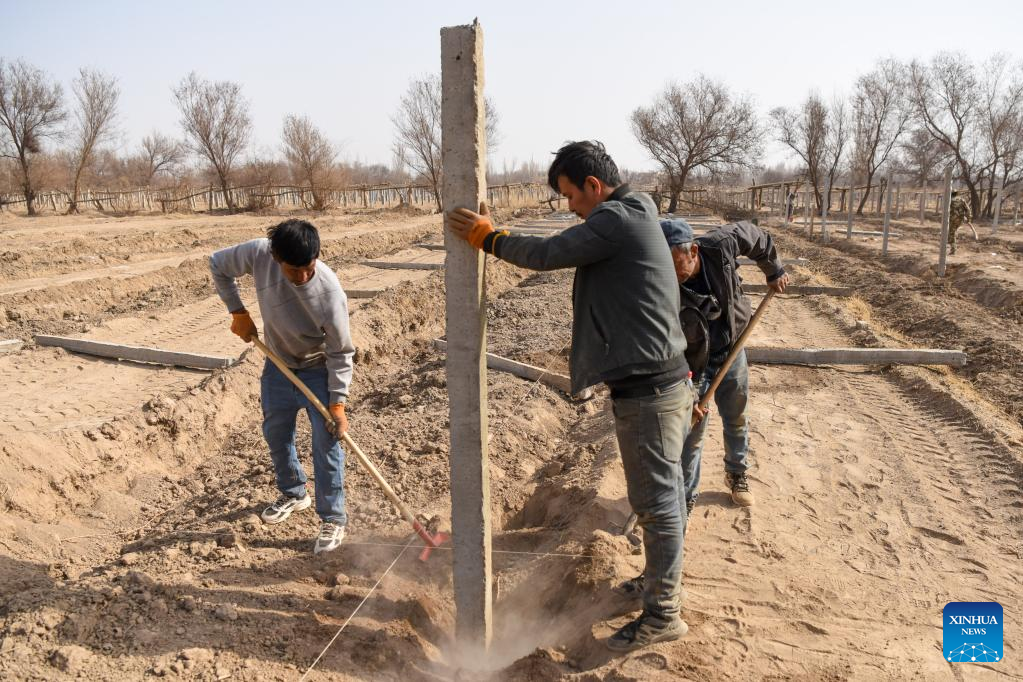 Farmers set up grape trellises in Putao Town of Turpan, northwest China's Xinjiang Uygur Autonomous Region, March 8, 2023. Every winter, farmers here bury grape vines underground to keep them warm during the cold weather and dig them out and put them on trellises in the springtime. More farming machines have been put into use, which not only saves labor costs, but also greatly increases efficiency. (Xinhua/Ding Lei)