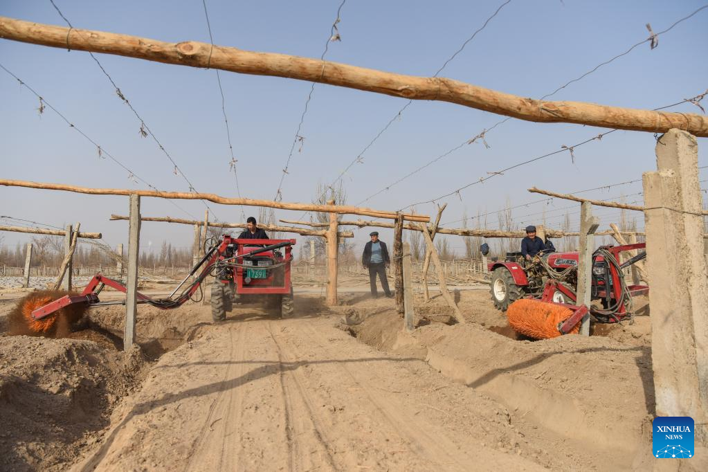 Farmers operate machines to dig out grape vines in Putao Town of Turpan, northwest China's Xinjiang Uygur Autonomous Region, March 8, 2023. Every winter, farmers here bury grape vines underground to keep them warm during the cold weather and dig them out and put them on trellises in the springtime. More farming machines have been put into use, which not only saves labor costs, but also greatly increases efficiency. (Xinhua/Ding Lei)