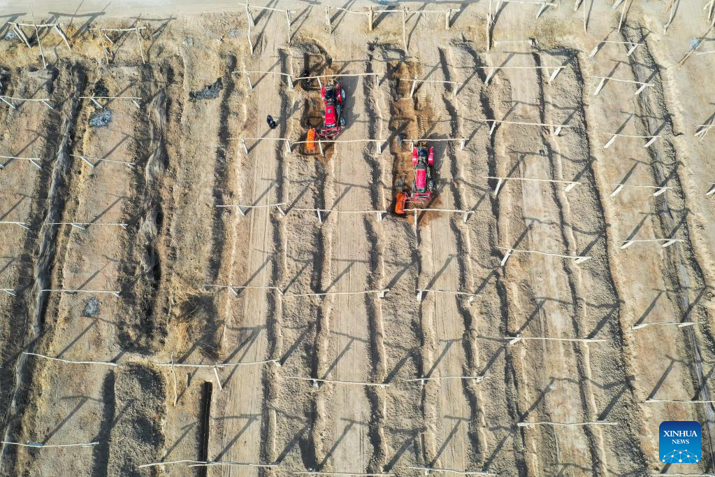 This aerial photo shows farmers operating machines to dig out grape vines in Putao Town of Turpan, northwest China's Xinjiang Uygur Autonomous Region, March 8, 2023. Every winter, farmers here bury grape vines underground to keep them warm during the cold weather and dig them out and put them on trellises in the springtime. More farming machines have been put into use, which not only saves labor costs, but also greatly increases efficiency. (Xinhua/Ding Lei)