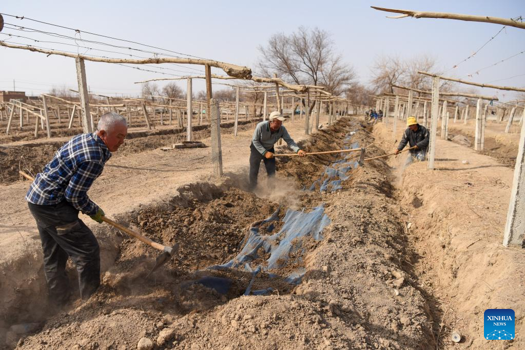 Farmers dig out grape vines in Putao Town of Turpan, northwest China's Xinjiang Uygur Autonomous Region, March 8, 2023. Every winter, farmers here bury grape vines underground to keep them warm during the cold weather and dig them out and put them on trellises in the springtime. More farming machines have been put into use, which not only saves labor costs, but also greatly increases efficiency. (Xinhua/Ding Lei)