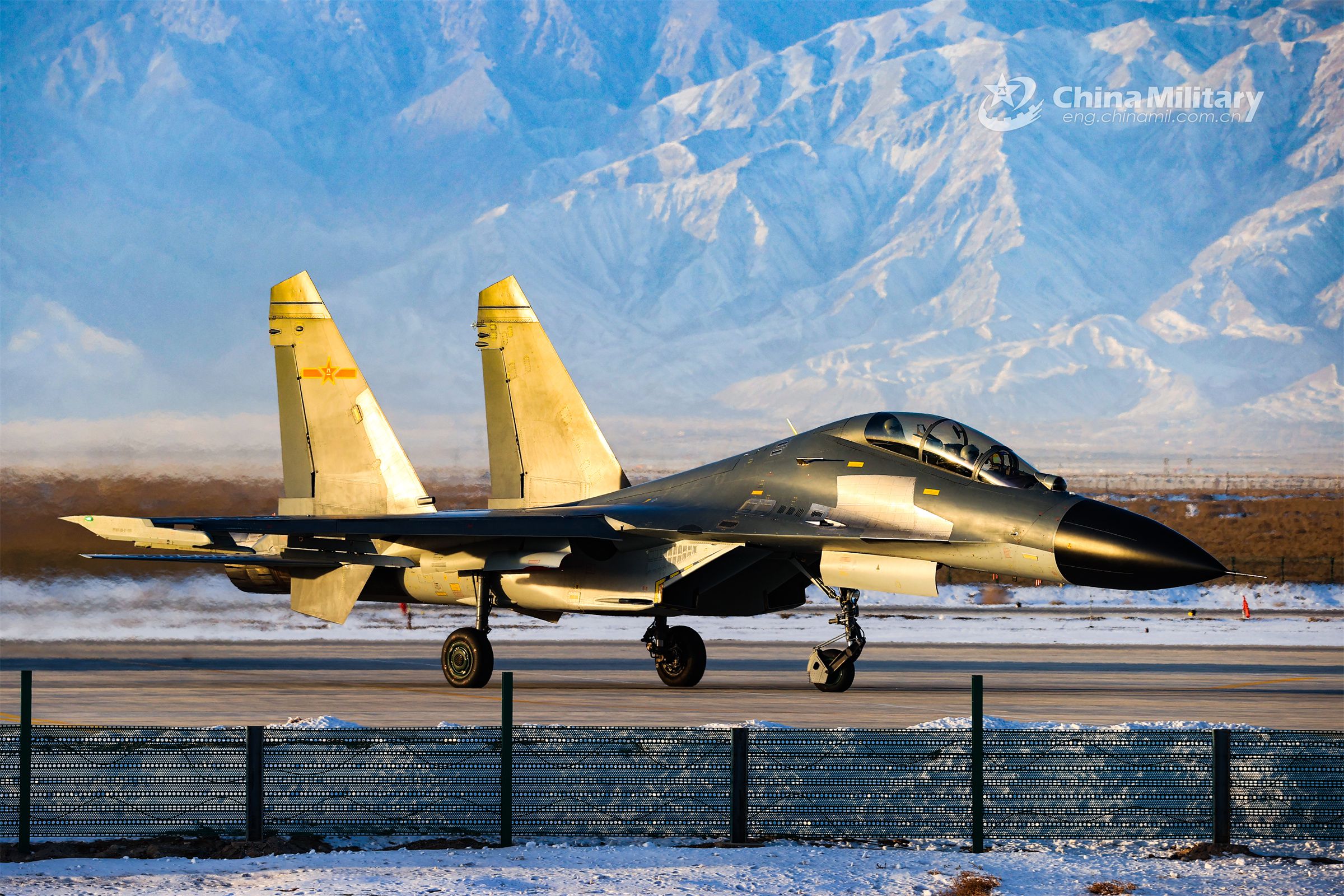 A fighter jet attached to an aviation brigade of the Air Force taxies on the runway before takeoff for a high-intensity flight training exercise in early February, 2023. (eng.chinamil.com.cn/Photo by Cui Baoliang)