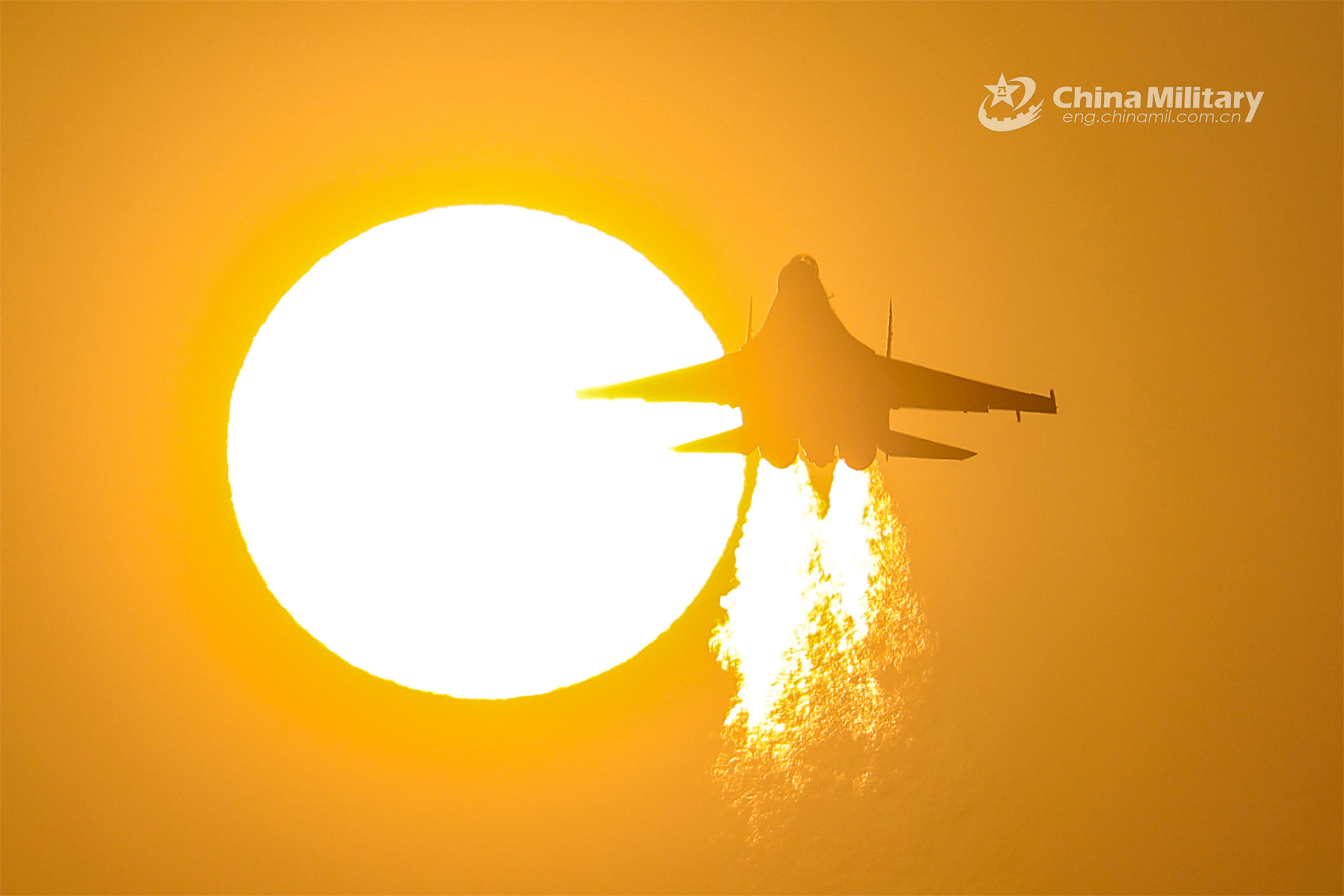 A fighter jet attached to an aviation brigade of the PLA Air Force soars into the sky during a high-intensity flight training exercise in early February, 2023. (eng.chinamil.com.cn/Photo by Cui Baoliang)