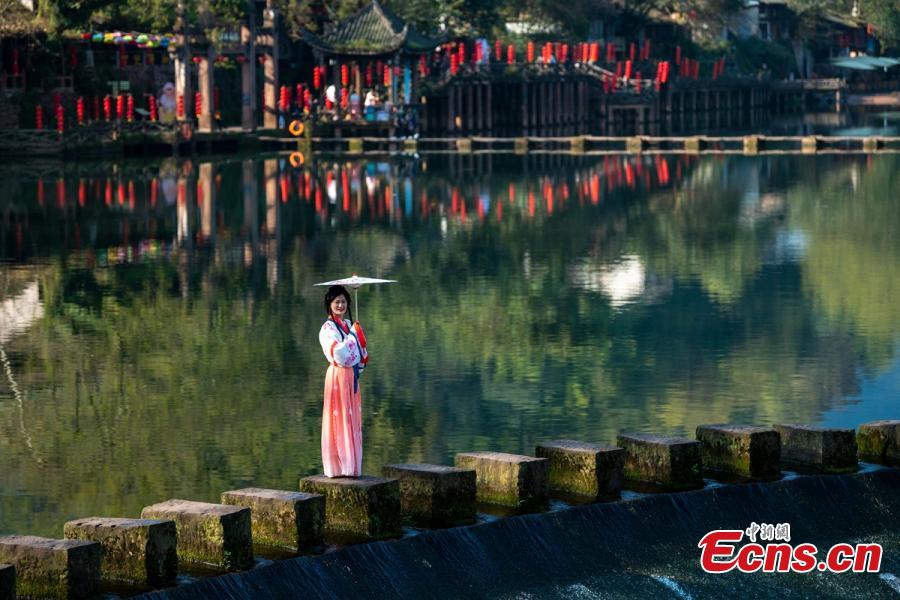 Women in traditional Hanfu costume celebrate Huazhao Festival at Liujiang ancient town of Hongya County, southwest China's Sichuan Province, March 8, 2023. (Photo: China News Service/Liu Zhongjun)