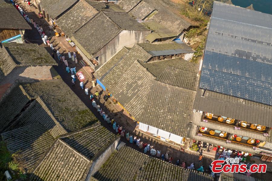 Women in traditional Hanfu costume celebrate Huazhao Festival at Liujiang ancient town of Hongya County, southwest China's Sichuan Province, March 8, 2023. (Photo: China News Service/Liu Zhongjun)