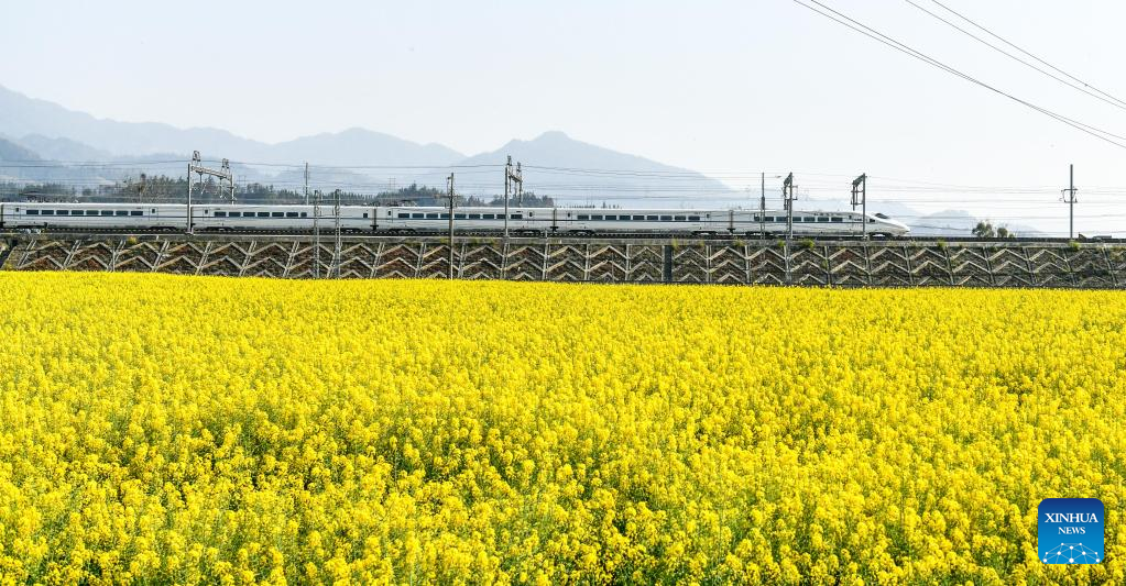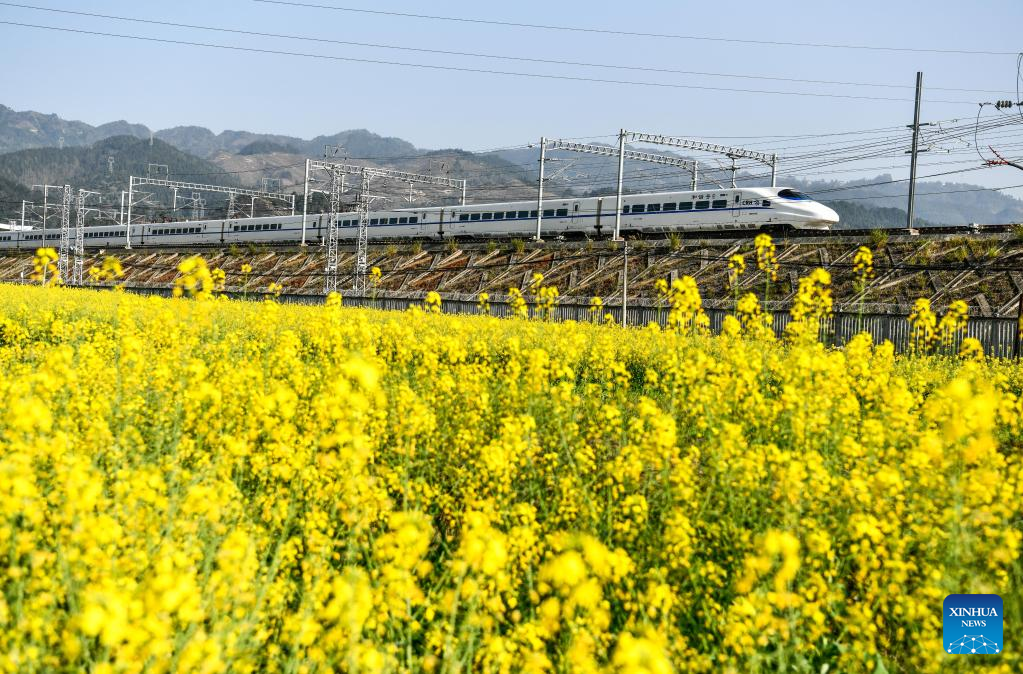 A bullet train passes by a cole flower field in Rongjiang County, in Qiandongnan Miao and Dong Autonomous Prefecture, southwest China's Guizhou Province, March 9, 2023. (Xinhua/Yang Wenbin)