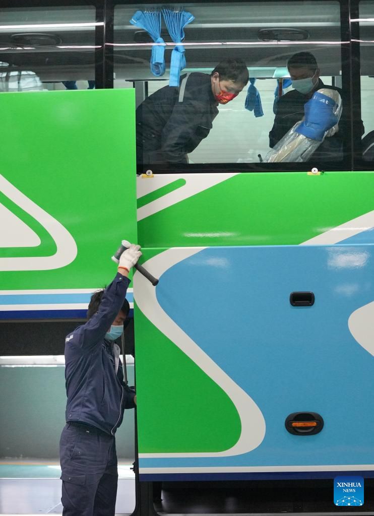Staff members fix the door of a luggage compartment of a bus at a work shop of the new energy factory of Zhengzhou Yutong Bus Co., Ltd. in Zhengzhou, central China's Henan Province, March 8, 2023. To catch orders, staff of the new energy factory of Yutong are busy on the assembly line. Since the beginning of this year, Yutong. who exported its bus to more than 30 countries and regions, has won many overseas orders. (Xinhua/Li An)