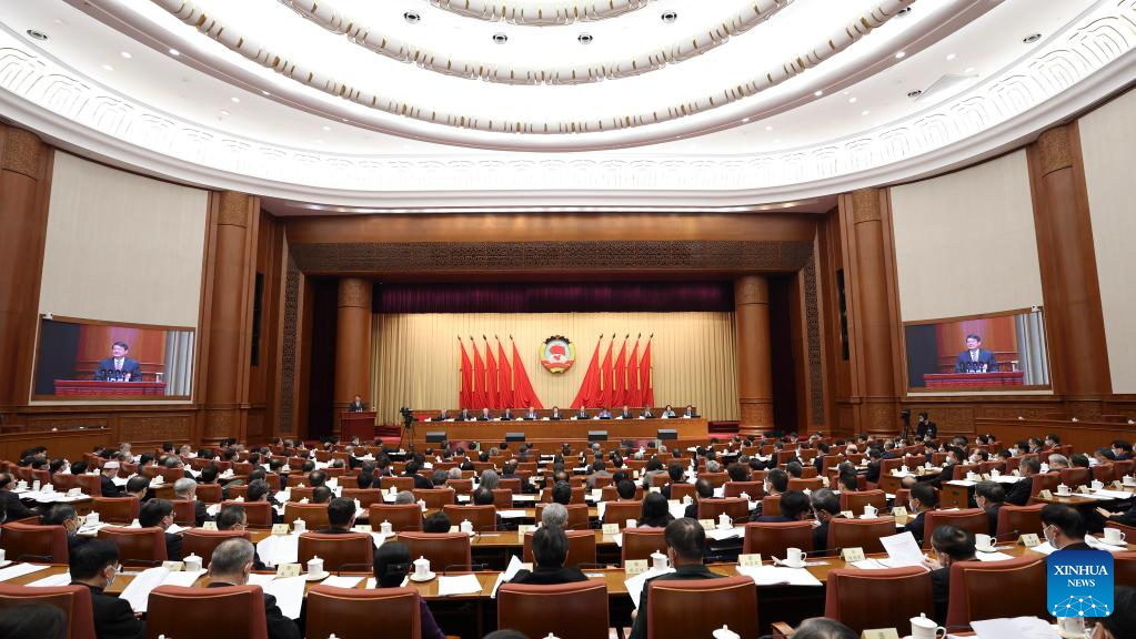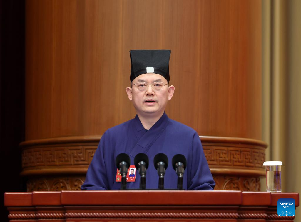 Xu Tao, a member of the 14th National Committee of the Chinese People's Political Consultative Conference (CPPCC), delivers a speech on behalf of the Central Committee of the Chinese Peasants and Workers Democratic Party at the main venue of a video conference of the first session of the 14th CPPCC National Committee in Beijing, capital of China, March 9, 2023. (Xinhua/Ding Haitao)