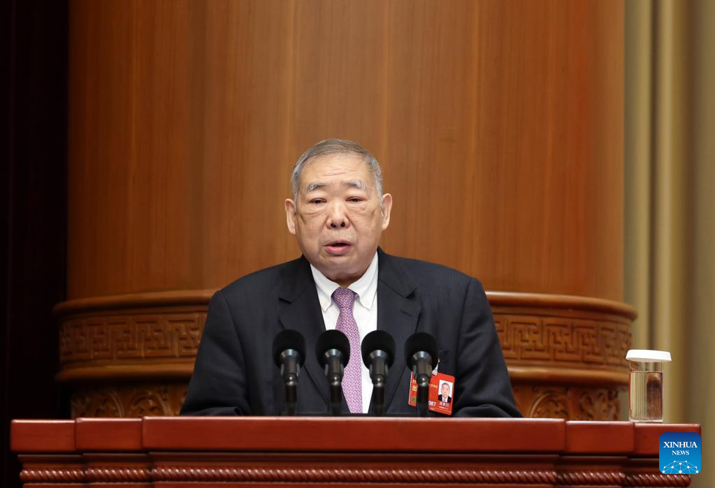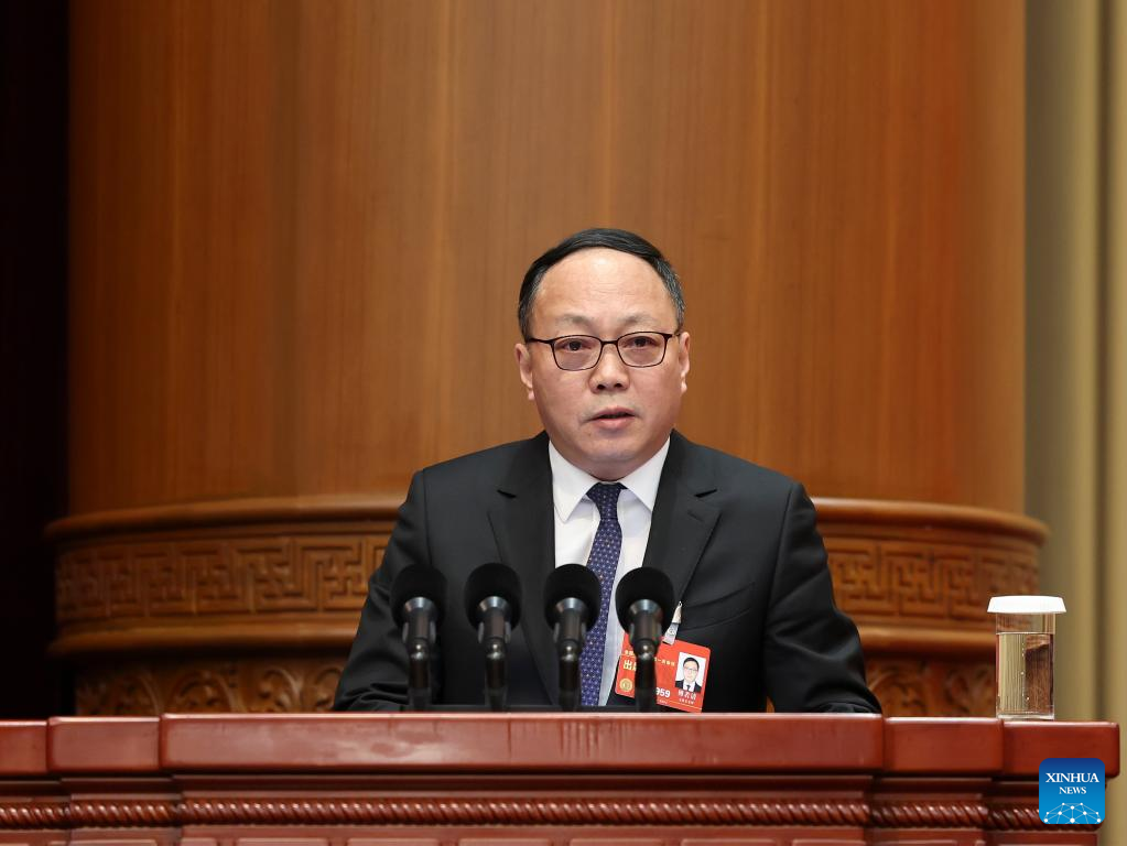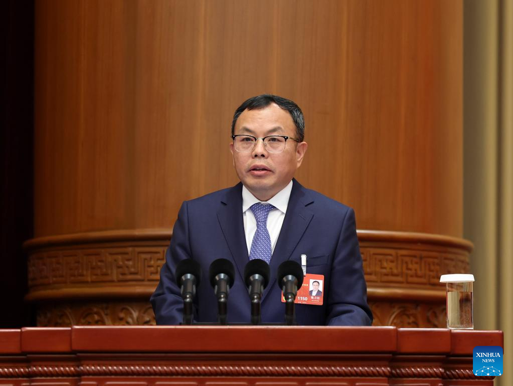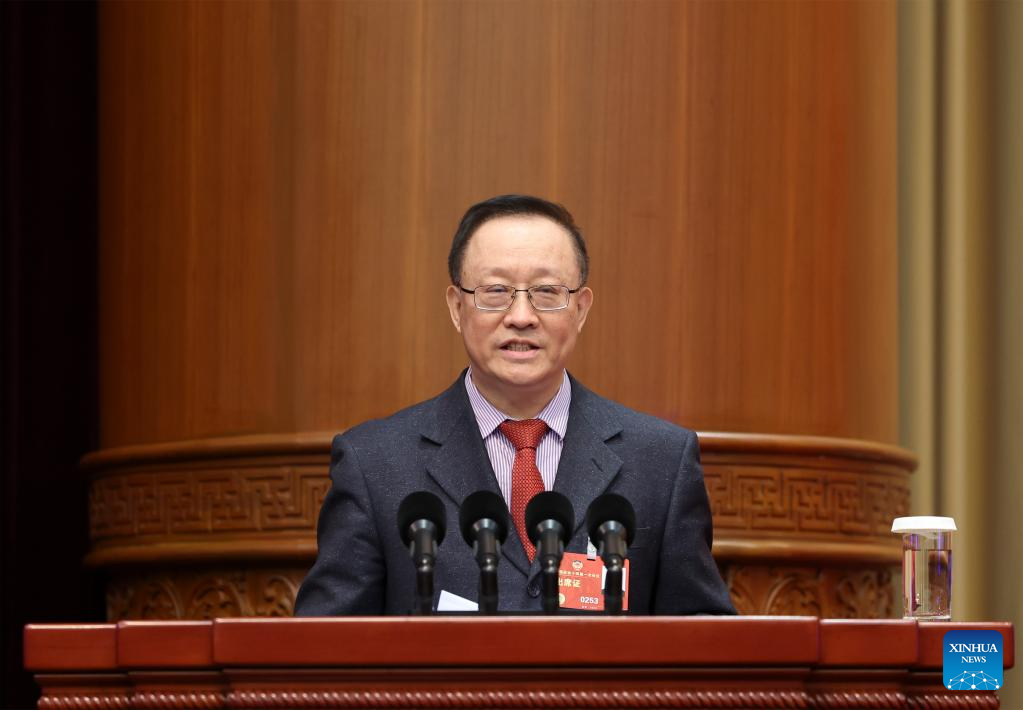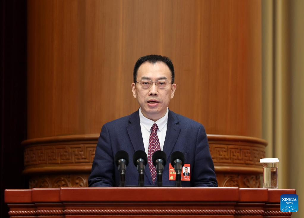 Ji Hongzhong, a member of the 14th National Committee of the Chinese People's Political Consultative Conference (CPPCC), delivers a speech at the main venue of a video conference of the first session of the 14th CPPCC National Committee in Beijing, capital of China, March 9, 2023. (Xinhua/Ding Haitao)