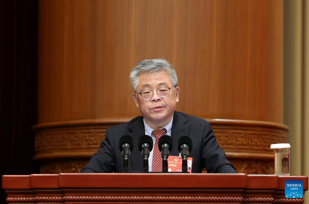 Li Shijie, a member of the 14th National Committee of the Chinese People's Political Consultative Conference (CPPCC), delivers a speech on behalf of the Central Committee of the China National Democratic Construction Association at the main venue of a video conference of the first session of the 14th CPPCC National Committee in Beijing, capital of China, March 9, 2023. (Xinhua/Ding Haitao)