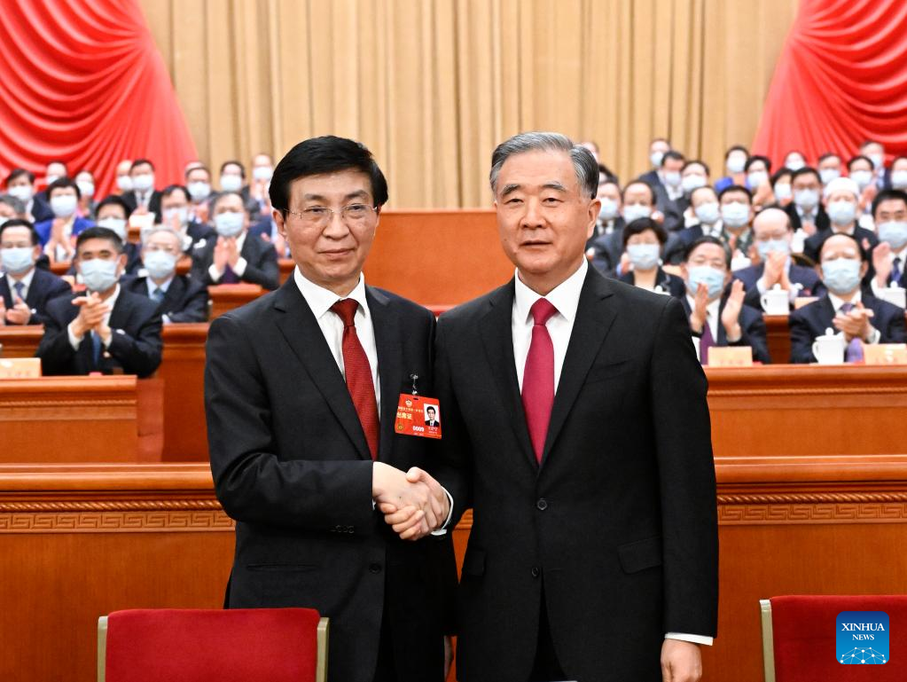 Wang Huning (L, front) shakes hands with Wang Yang at the third plenary meeting of the first session of the 14th National Committee of the Chinese People's Political Consultative Conference (CPPCC) at the Great Hall of the People in Beijing, capital of China, March 10, 2023. Wang Huning was elected chairman of the 14th National Committee of the CPPCC, the country's top political advisory body, on Friday. (Xinhua/Li Xueren)