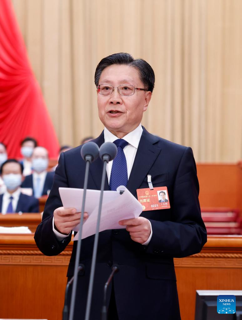 Wang Dongming presides over the fourth plenary meeting of the first session of the 14th National People's Congress (NPC) at the Great Hall of the People in Beijing, capital of China, March 11, 2023. (Xinhua/Huang Jingwen)