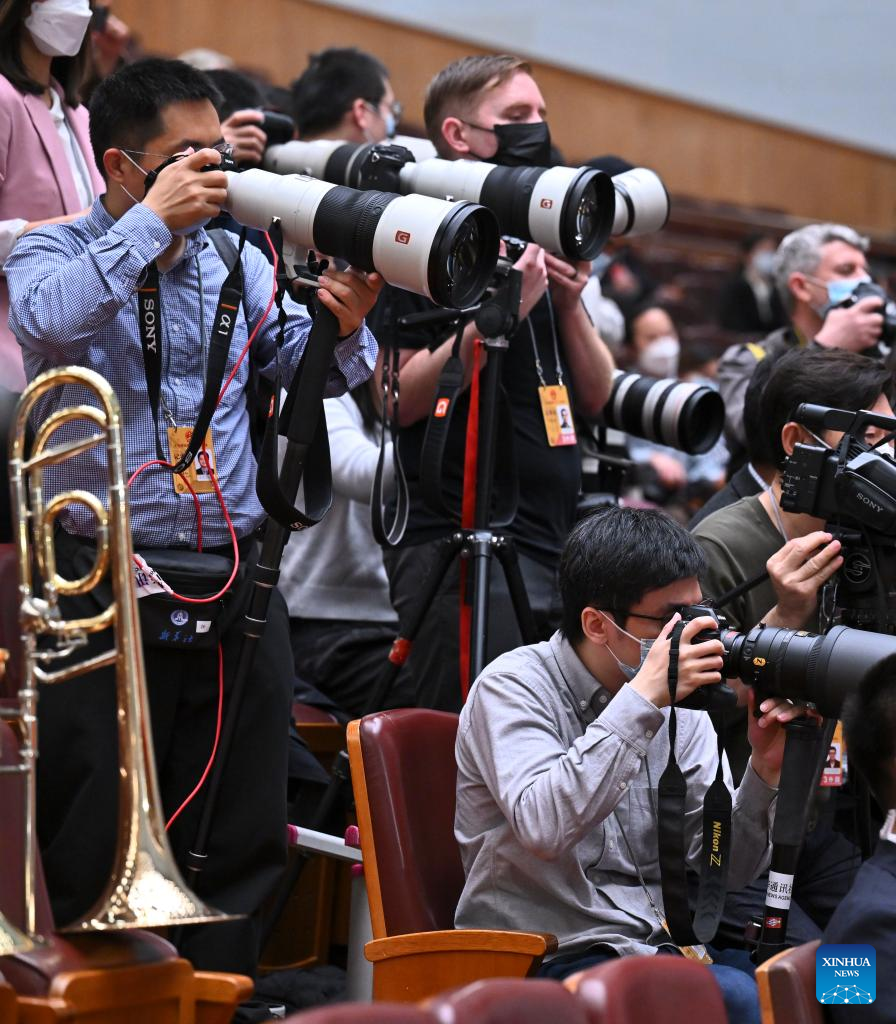 Journalists work during the fourth plenary meeting of the first session of the 14th National People's Congress (NPC) at the Great Hall of the People in Beijing, capital of China, March 11, 2023. (Xinhua/Li Xin)