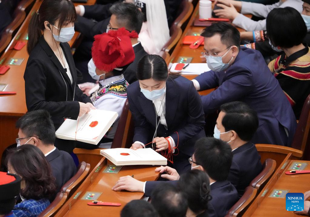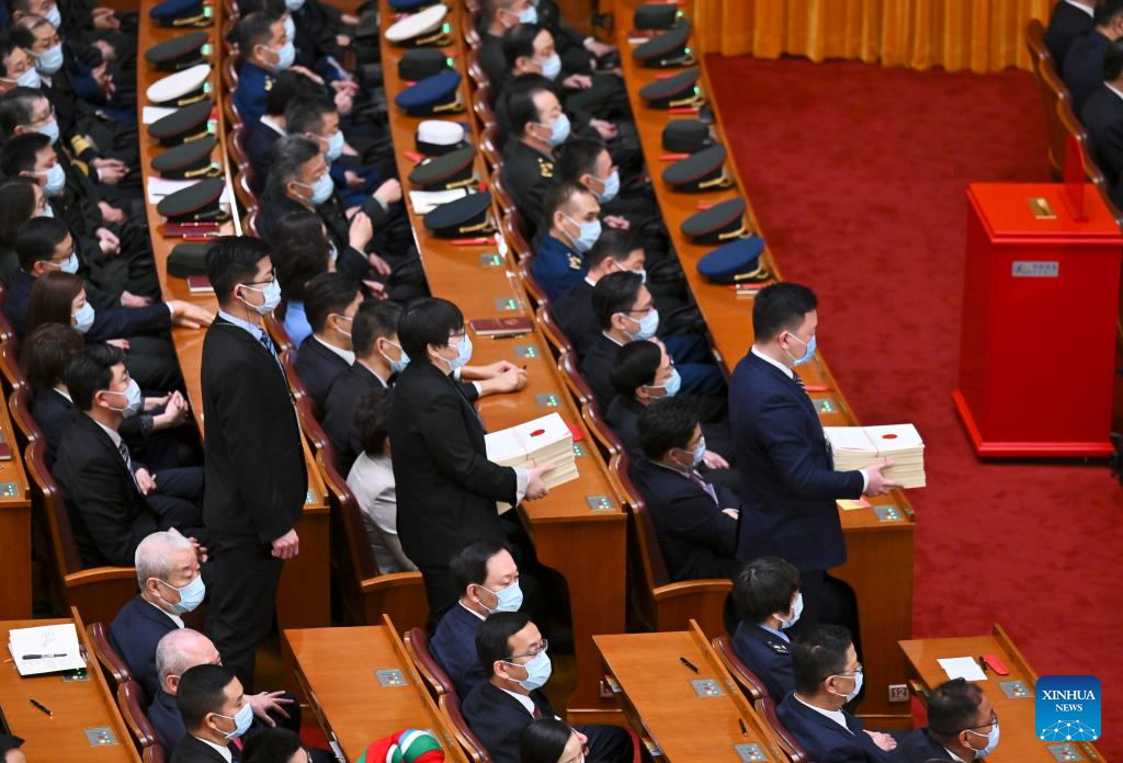 Staff members distribute ballots at the fourth plenary meeting of the first session of the 14th National People's Congress (NPC) at the Great Hall of the People in Beijing, capital of China, March 11, 2023. (Xinhua/Xing Guangli)