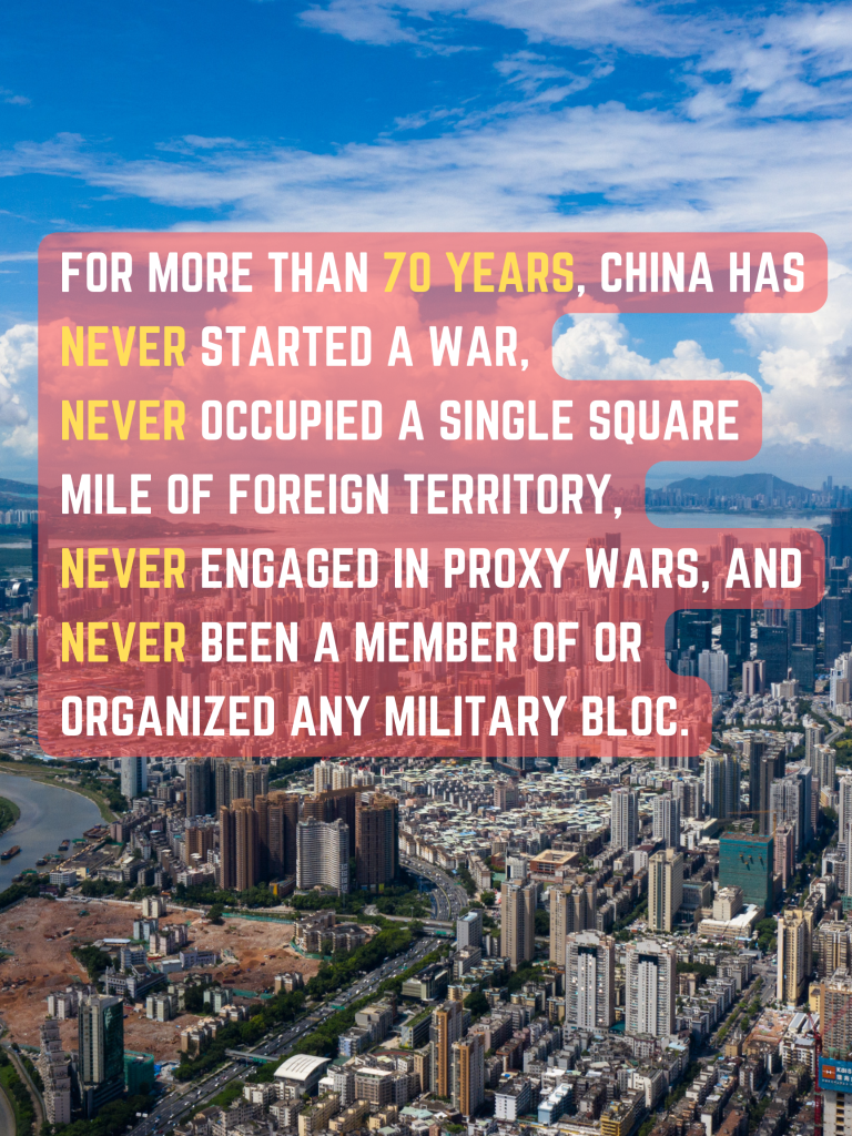 For more than 70 years, China has never started a war, never occupied a single square mile of foreign territory, never engaged in proxy wars, and never been a member of or organized any military bloc.