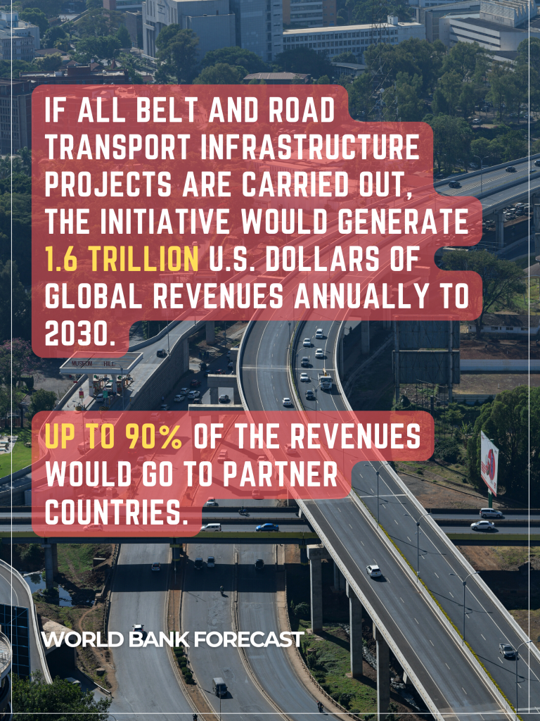 Take the Belt and Road Initiative (BRI). According to a World Bank forecast, if all Belt and Road transport infrastructure projects are carried out, the initiative would generate 1.6 trillion U.S. dollars of global revenues annually to 2030. Up to 90 percent of the revenues would go to partner countries.