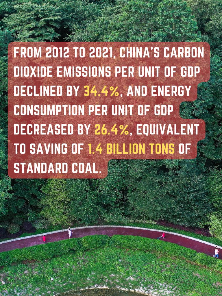 From 2012 to 2021, China's carbon dioxide emissions per unit of GDP declined by 34.4 percent, and energy consumption per unit of GDP decreased by 26.4 percent, equivalent to saving of 1.4 billion tons of standard coal.