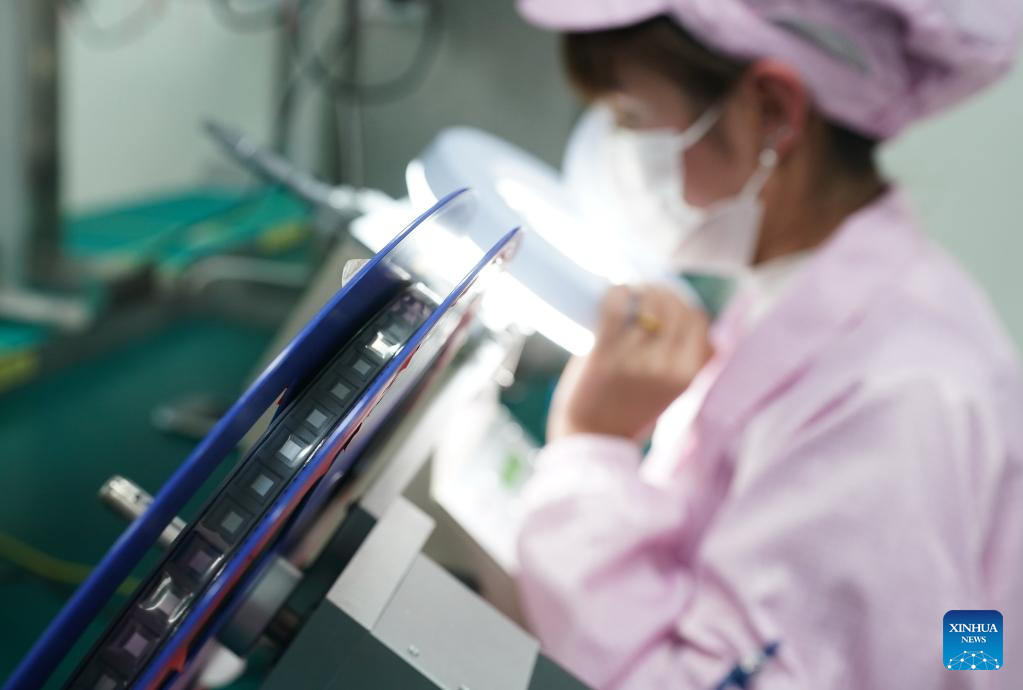 A staff member checks chip products at Nanjing V-Test Semiconductor Technology Co., Ltd. in Pukou Economic Development Zone of Nanjing, east China's Jiangsu Province, March 9, 2023. In recent years, Pukou Economic Development Zone in Nanjing has made efforts in the integrated circuit industry, a new contributor to the development of the regional economy. (Xinhua/Ji Chunpeng)