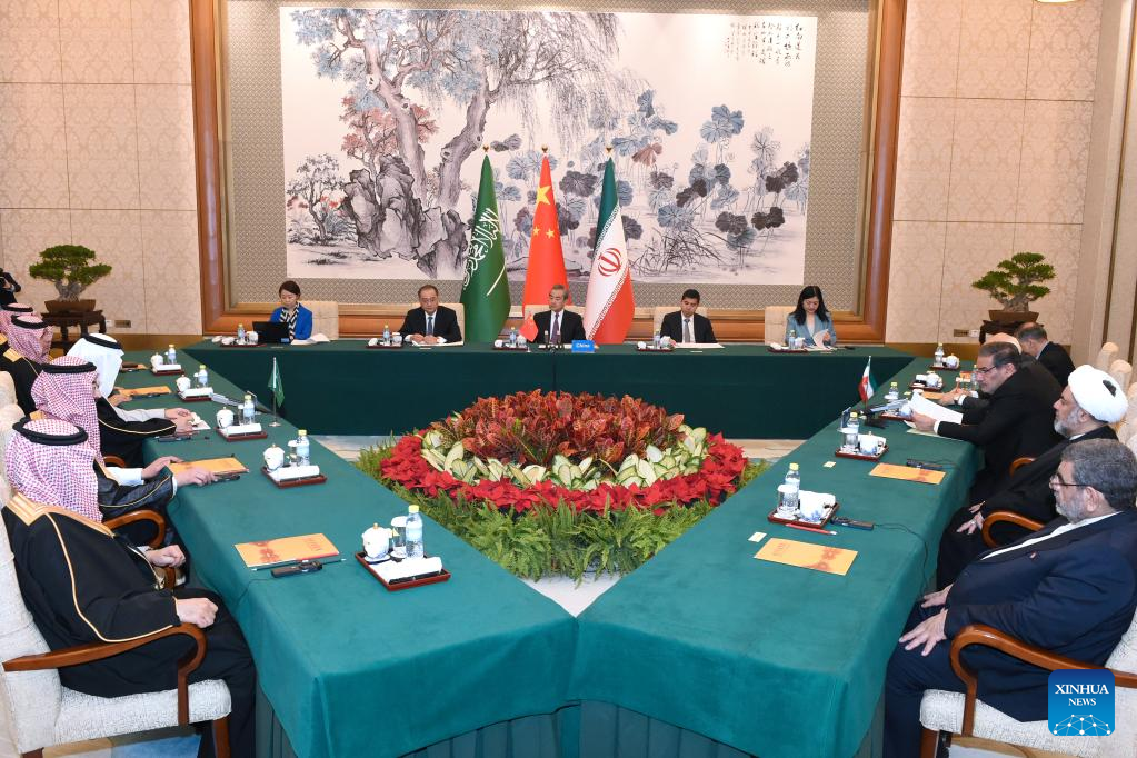 BEIJING, March 10 (Xinhua) -- As announced by China, Saudi Arabia and Iran on Friday, the latter two have reached a deal which includes the agreement to resume diplomatic relations and reopen embassies and missions within two months.