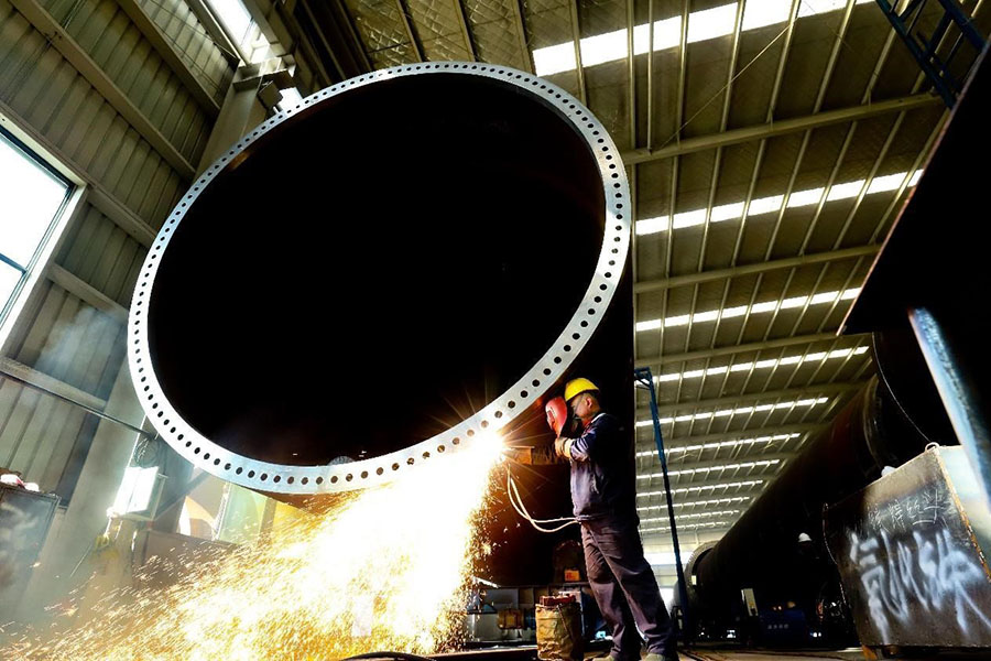 A worker welds a wind turbine tower in a manufacturing base in Gaotai county, Zhangye, northwest China's Gansu province, March 1, 2023. (Photo by Wang Jiang/People's Daily Online)
