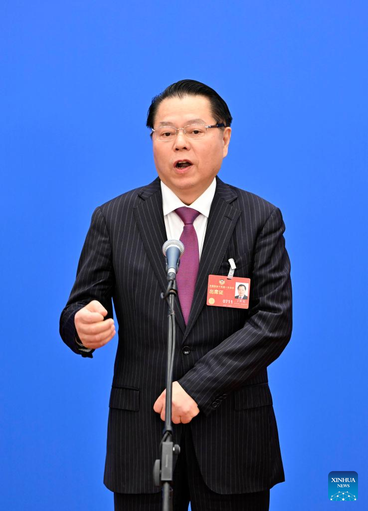 Ding Zuohong, a member of the 14th National Committee of the Chinese People's Political Consultative Conference (CPPCC), is interviewed ahead of the closing meeting of the first session of the 14th CPPCC National Committee at the Great Hall of the People in Beijing, capital of China, March 11, 2023. (Xinhua/Chen Yichen)
