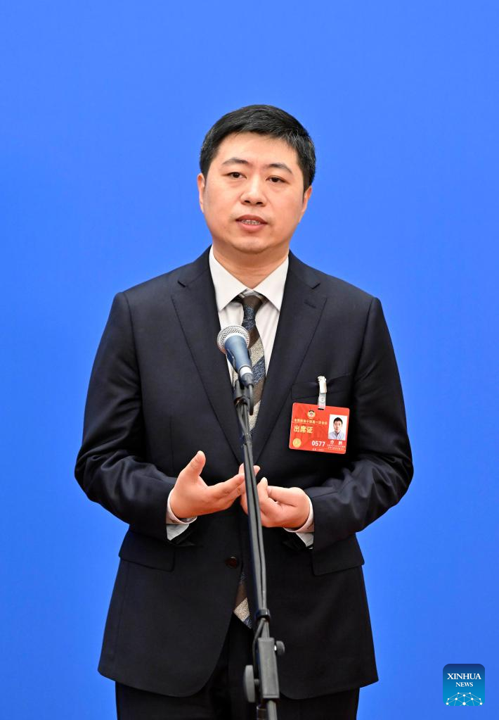 Song Hailiang, a member of the 14th National Committee of the Chinese People's Political Consultative Conference (CPPCC), is interviewed ahead of the closing meeting of the first session of the 14th CPPCC National Committee at the Great Hall of the People in Beijing, capital of China, March 11, 2023. (Xinhua/Chen Yichen)