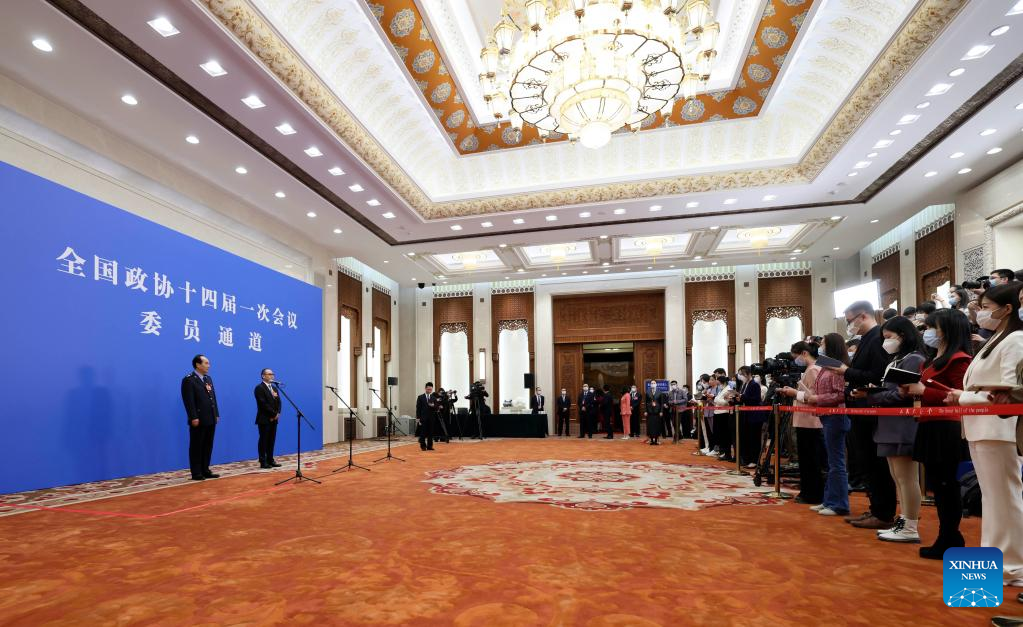 Members of the 14th National Committee of the Chinese People's Political Consultative Conference (CPPCC) are interviewed ahead of the closing meeting of the first session of the 14th CPPCC National Committee at the Great Hall of the People in Beijing, capital of China, March 11, 2023. (Xinhua/Zhang Cheng)