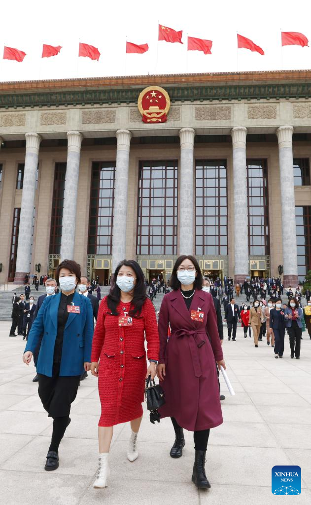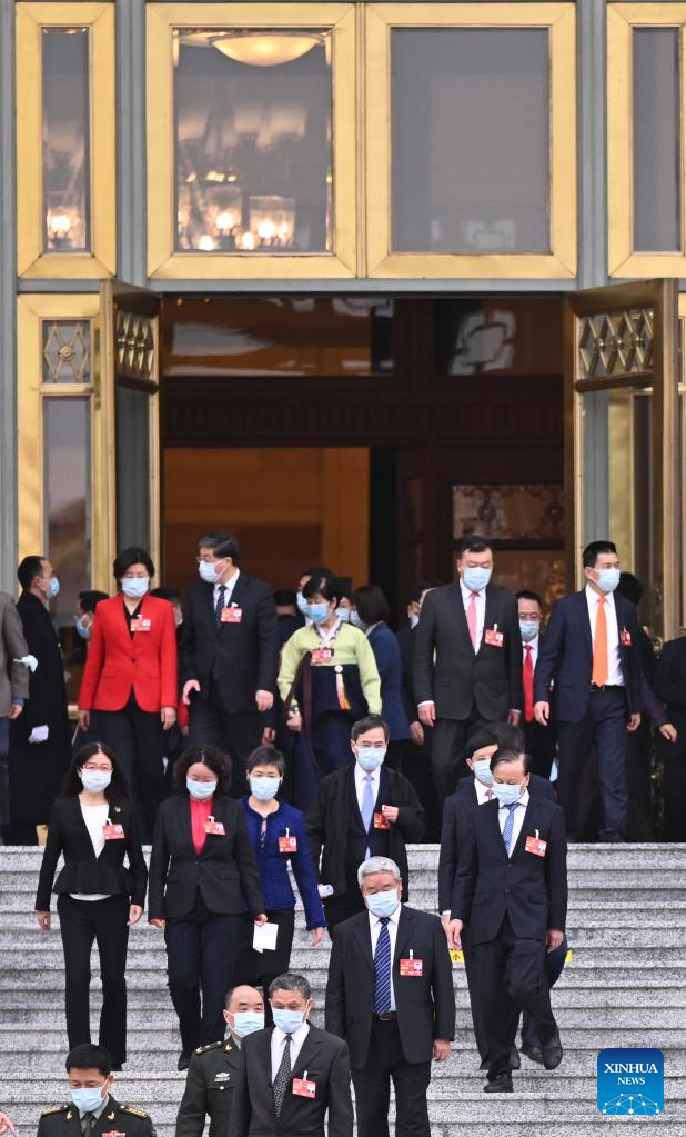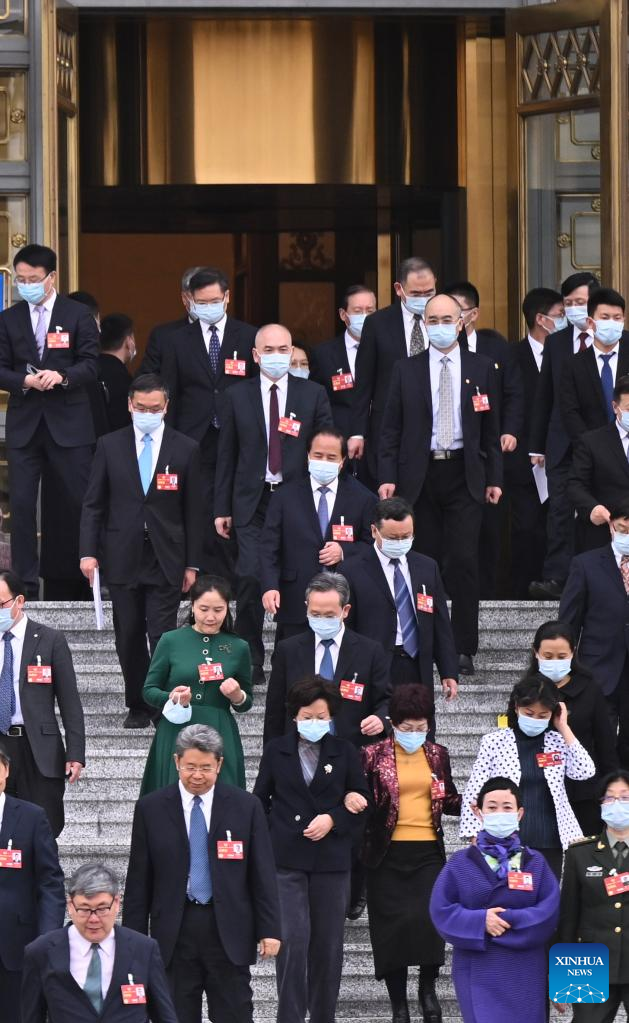 Members of the 14th National Committee of the Chinese People's Political Consultative Conference (CPPCC) leave the Great Hall of the People after the closing meeting of the first session of the 14th CPPCC National Committee in Beijing, capital of China, March 11, 2023. (Xinhua/Liu Jinhai)