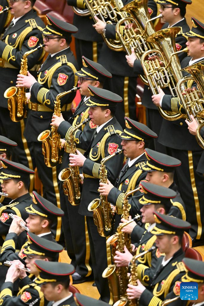 The military band of the Chinese People's Liberation Army performs at the closing meeting of the first session of the 14th National Committee of the Chinese People's Political Consultative Conference (CPPCC) at the Great Hall of the People in Beijing, capital of China, March 11, 2023. (Xinhua/Chen Yichen)