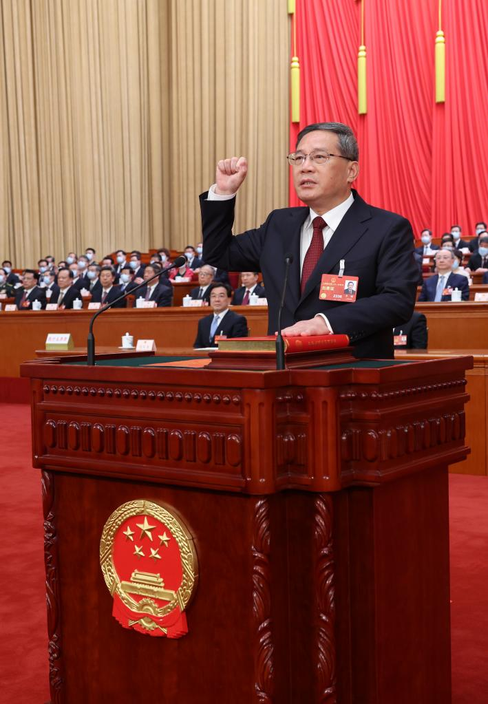 Newly appointed Chinese Premier Li Qiang makes a public pledge of allegiance to the Constitution at the Great Hall of the People in Beijing, capital of China, March 11, 2023. Li was endorsed as Chinese premier at a plenary meeting of the first session of the 14th National People's Congress, the country's national legislature. (Xinhua/Pang Xinglei)