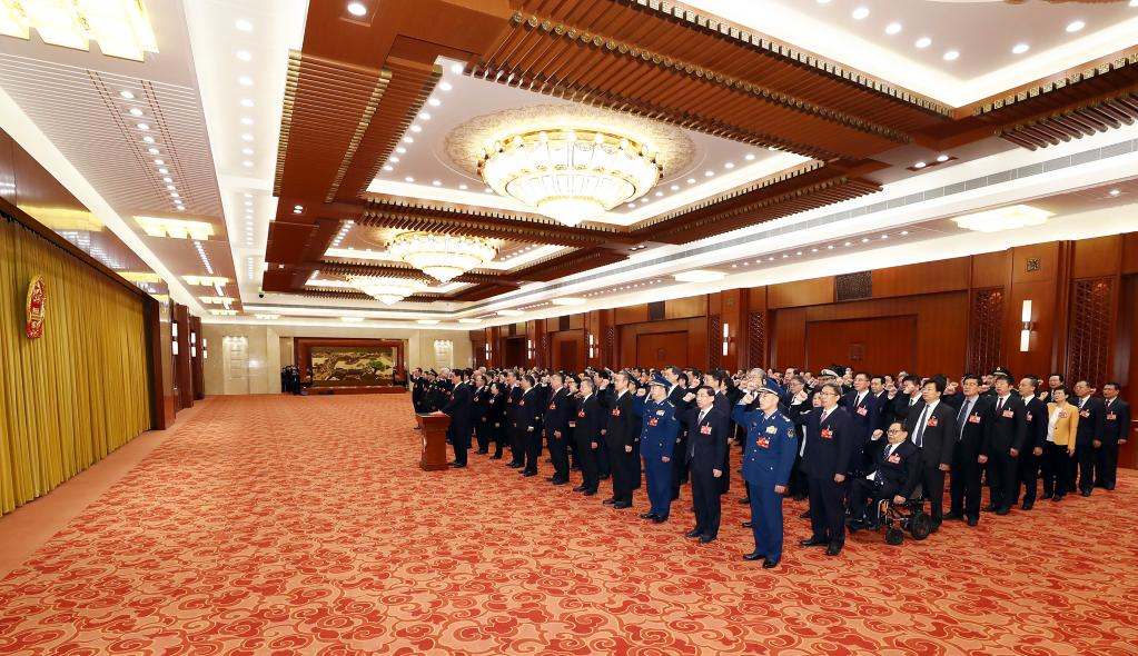 Members of the Standing Committee of the 14th National People's Congress (NPC) pledge allegiance to the Constitution in Beijing, capital of China, March 11, 2023. (Xinhua)