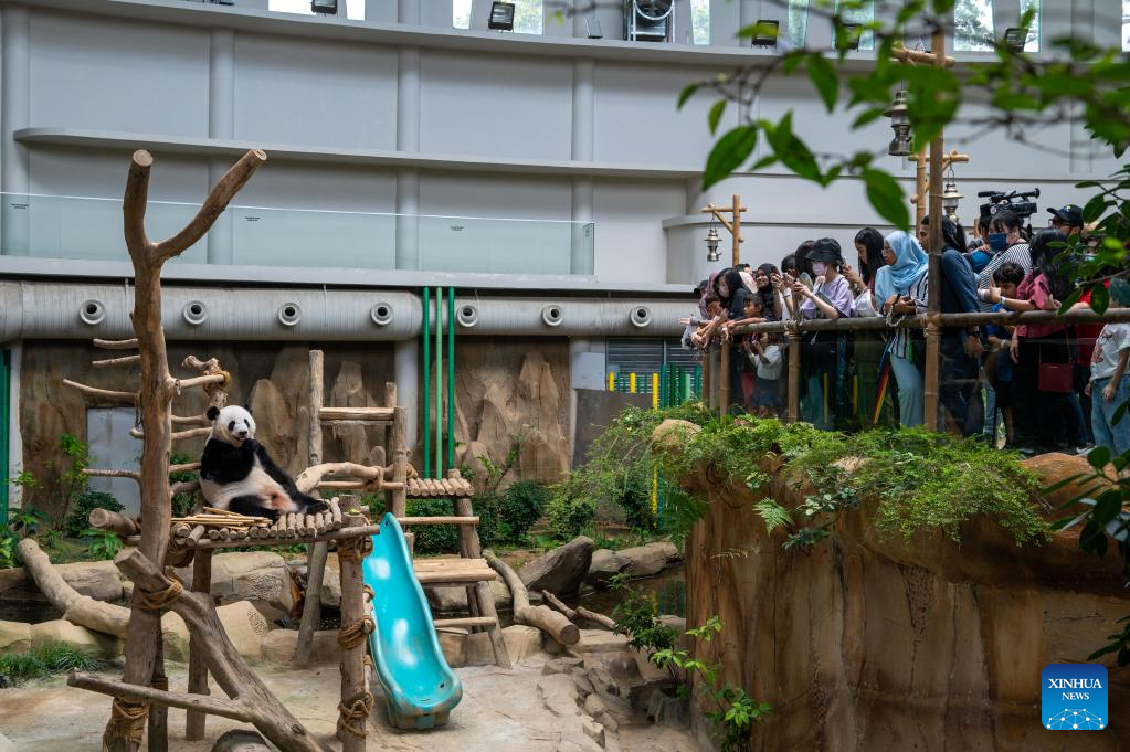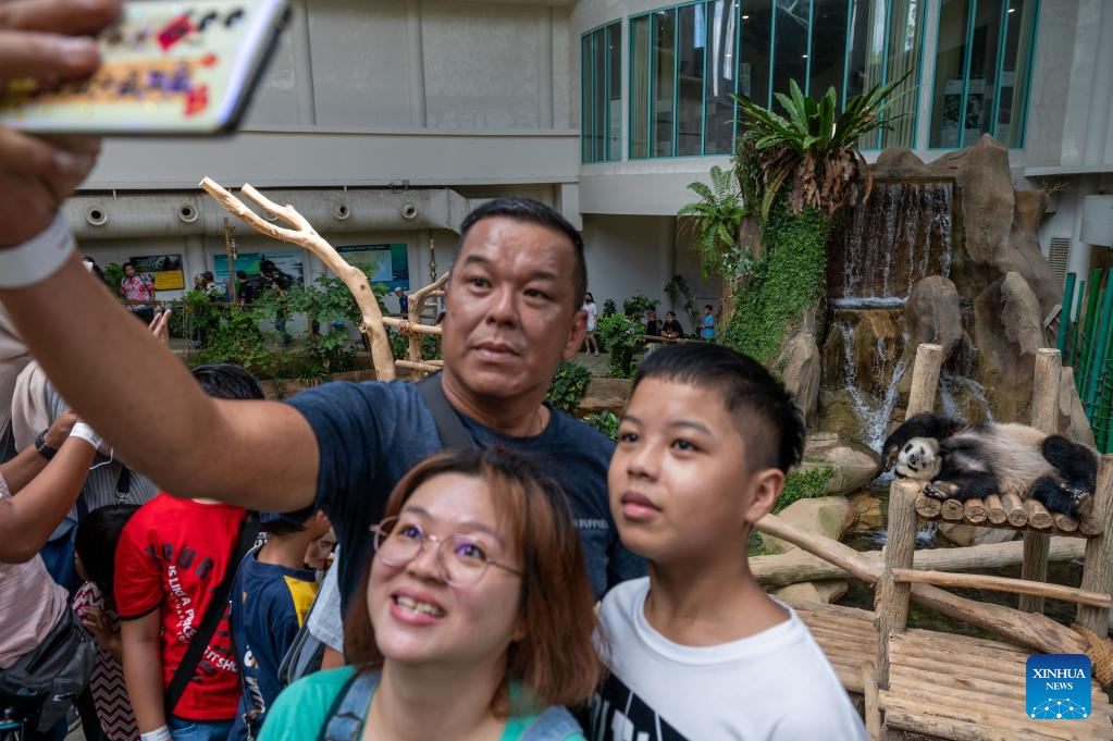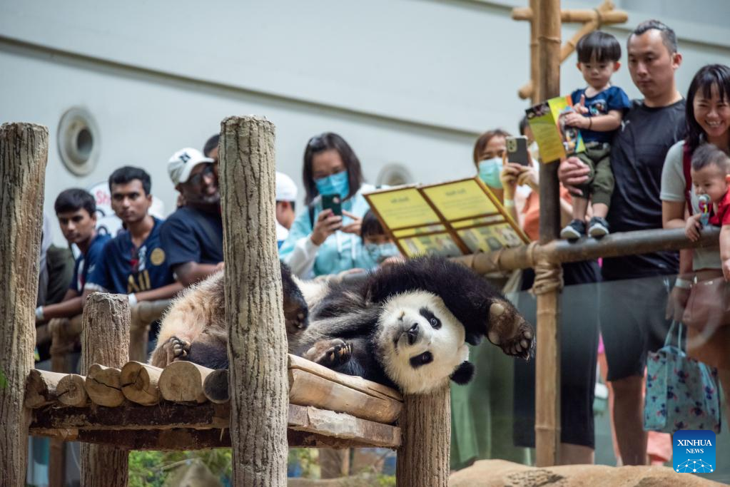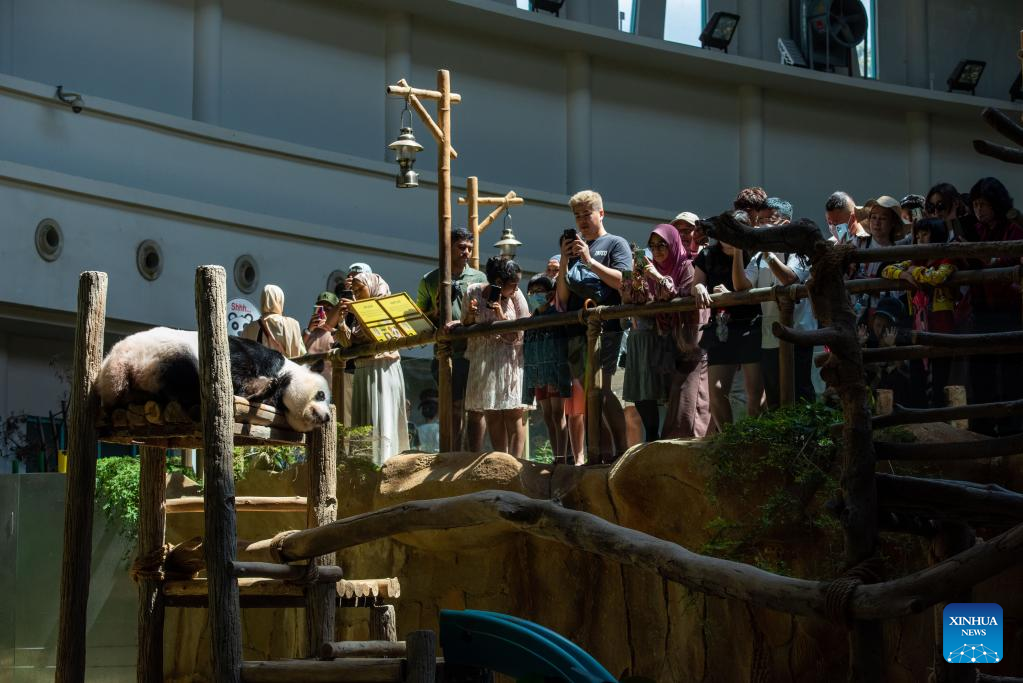 Tourists look at a giant panda at Zoo Negara near Kuala Lumpur, Malaysia, March 11, 2023. The Giant Panda Conservation Center in Zoo Negara near Kuala Lumpur is currently home to a family of four, including the giant panda father Xing Xing, mother Liang Liang as well as their daughters Yi Yi and Sheng Yi. (Photo by Chong Voon Chung/Xinhua)