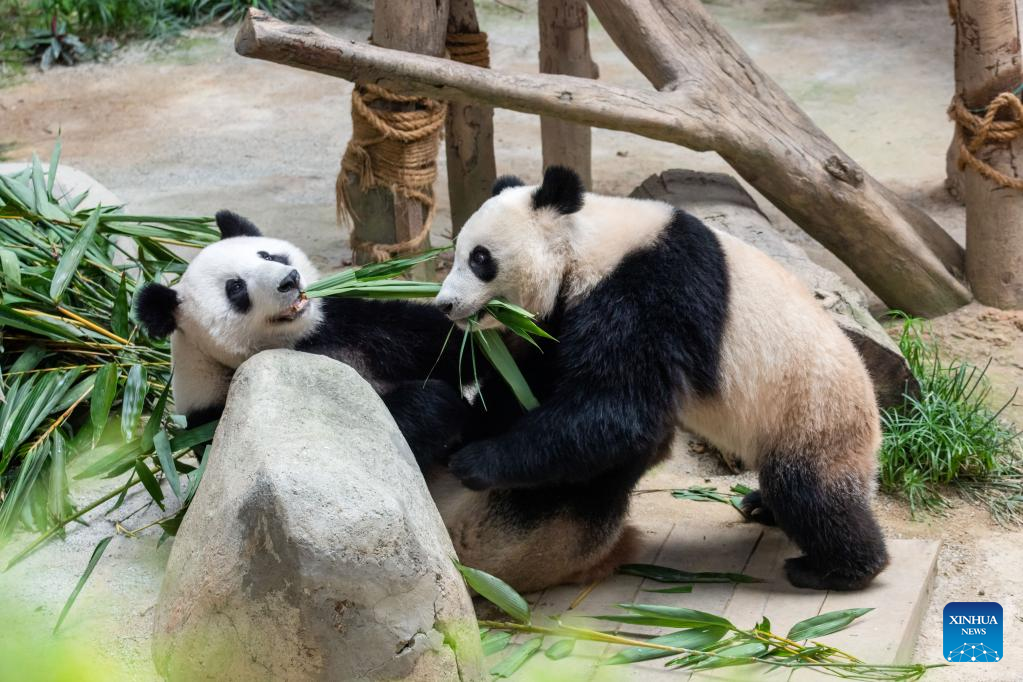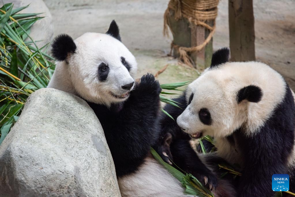 Giant panda Liang Liang (L) and Sheng Yi eat bamboo leaves at Zoo Negara near Kuala Lumpur, Malaysia, March 11, 2023. The Giant Panda Conservation Center in Zoo Negara near Kuala Lumpur is currently home to a family of four, including the giant panda father Xing Xing, mother Liang Liang as well as their daughters Yi Yi and Sheng Yi. (Photo by Chong Voon Chung/Xinhua)