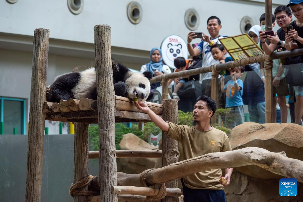 A giant panda keeper feeds Sheng Yi at Zoo Negara near Kuala Lumpur, Malaysia, March 11, 2023. The Giant Panda Conservation Center in Zoo Negara near Kuala Lumpur is currently home to a family of four, including the giant panda father Xing Xing, mother Liang Liang as well as their daughters Yi Yi and Sheng Yi. (Photo by Chong Voon Chung/Xinhua)