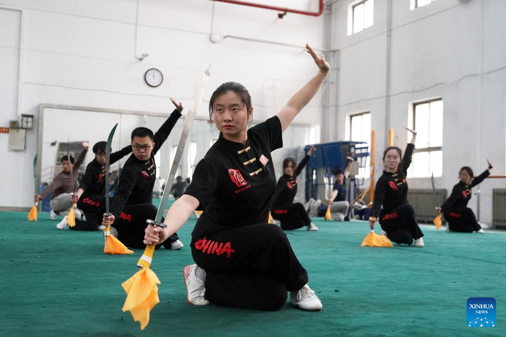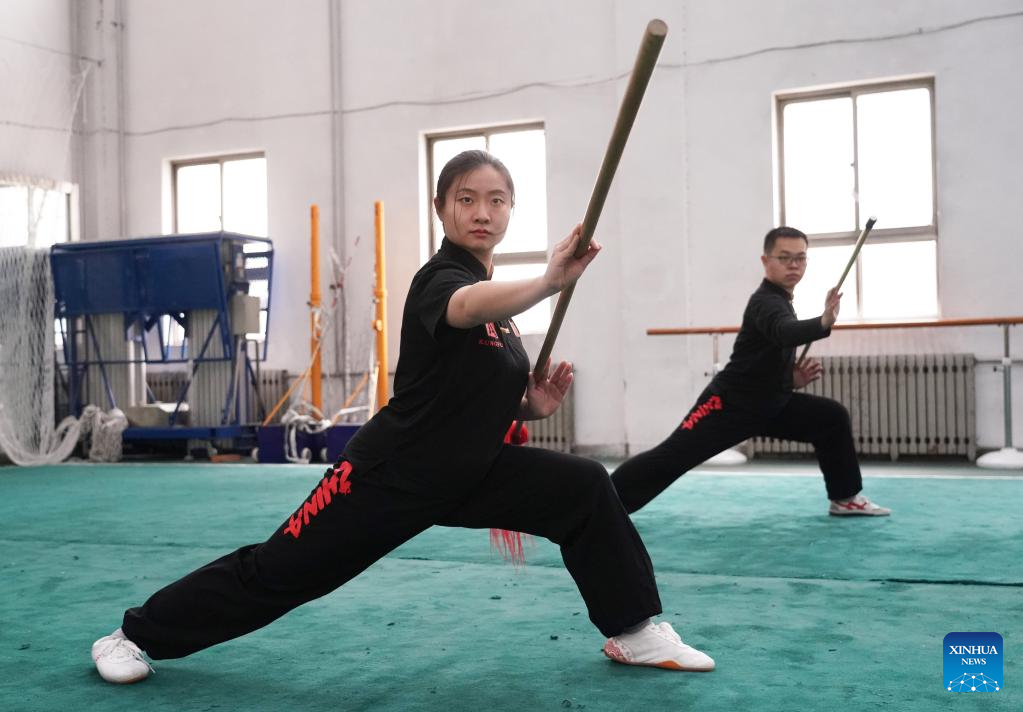 BEIJING, March 11 (Xinhua) -- Lifting a spear, Li Jinqi pulled it across her shoulders and spun it quickly. Following her example were 10 peers in two rows who wore the same Kungfu-style garments and produced the same movements.