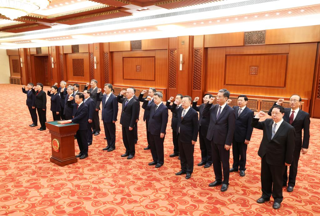 State Council's ministers, heads of commissions, governor of the central bank, and auditor-general pledge allegiance to the Constitution in Beijing, capital of China, March 12, 2023. (Xinhua/Pang Xinglei)