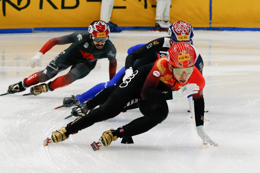 Lin Xiaojun (front) of China competes in the final A of men's 5000m relay at the ISU World Short Track Speed Skating Championships in Seoul, South Korea, March 12, 2023. (Xinhua/Wang Yiliang)