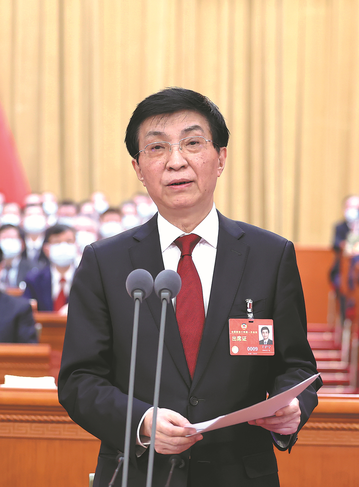 Wang Huning, China's top political adviser, addresses the closing meeting of the first session of the 14th CPPCC National Committee in Beijing on Saturday. [HUANG JINGWEN/XINHUA]