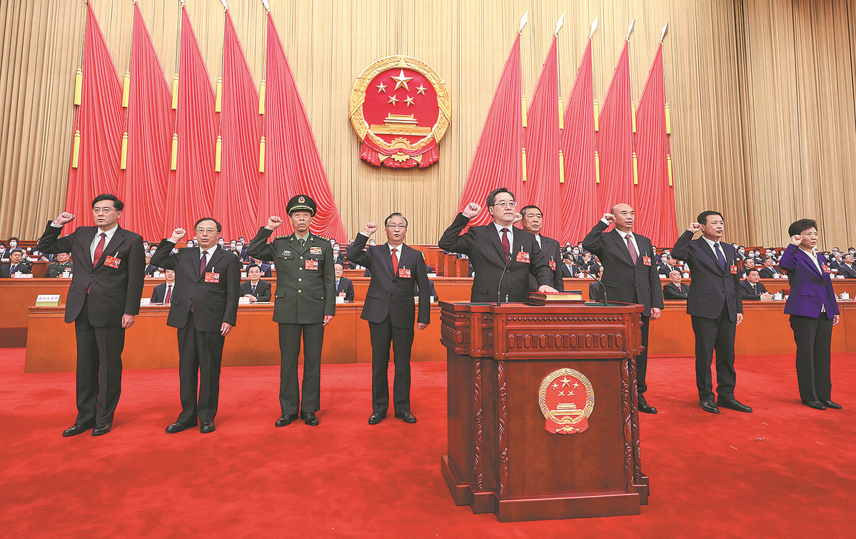 Key State officials, including vice-premiers and state councilors, make a public pledge of allegiance to China's Constitution at the first session of the 14th NPC on Sunday. [FENG YONGBIN/CHINA DAILY]