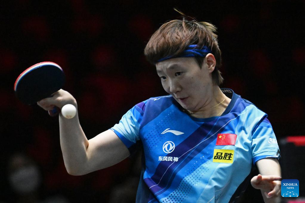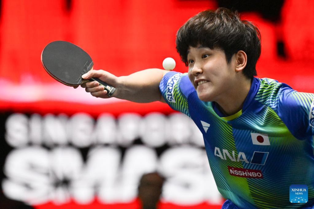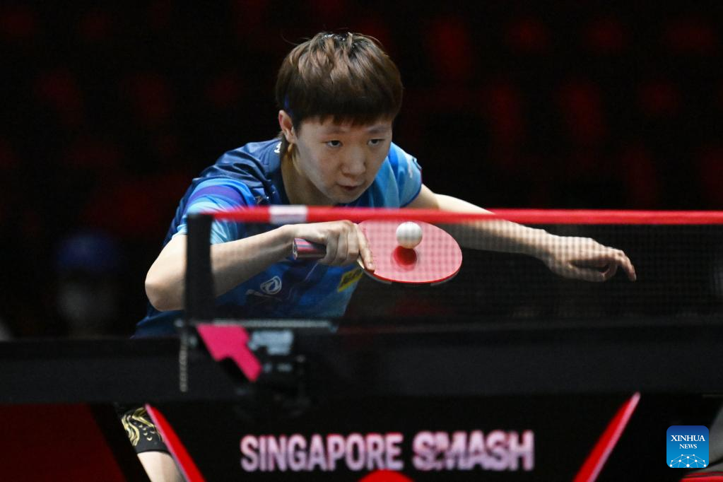 Wang Manyu of China hits a return during the women's singles round of 64 match against Lee Ho Ching of China's Hong Kong at World Table Tennis (WTT) Singapore Smash in Singapore on March 12, 2023. (Photo by Then Chih Wey/Xinhua)