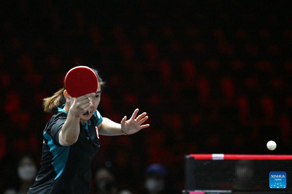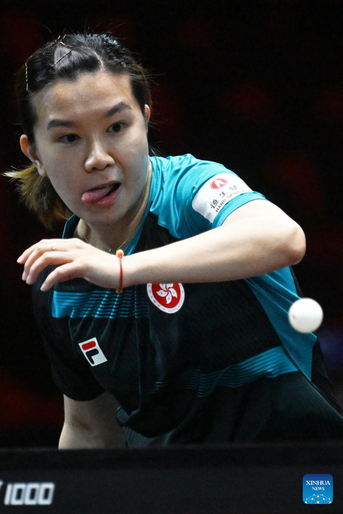 Lee Ho Ching of China's Hong Kong hits a return during the women's singles round of 64 match against Wang Manyu of China at World Table Tennis (WTT) Singapore Smash in Singapore on March 12, 2023. (Photo by Then Chih Wey/Xinhua)